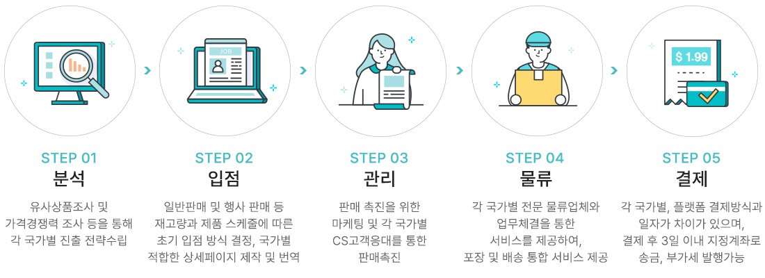국내 쇼셜마켓, 오픈마켓, 전문몰과 폐쇄몰 외에 중국(TAOBAO), 베트남(LAZADA, SENDO), 말레이시아(LAZADA, SHOPEE)의 온라인 마켓을 한번에 등록, 관리하여 브랜드사의 상품을 다 국가의 E채널을 통한 노출, 판매를 진행합니다.